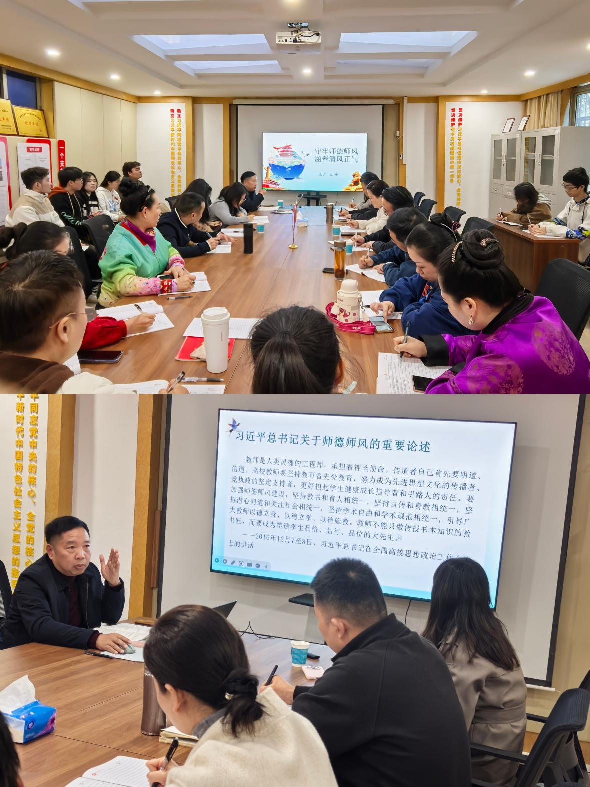 专题党课中,王平以“守牢师德师风 涵养清风正气”为主题,从“师德师风建设的重要意义”“师德师风建设的主要法规文献”“ 师德师风主要问题及表现”“如何立师德、正师风”四个方面,结合工作实际及近年来高校师德师风反面典型案例,对加强师德师风建设进行了深入浅出地讲解,深刻剖析了违反师德师风行为的严重危害,警示全体教师要时刻保持清醒头脑,坚守职业道德,守牢廉洁底线,警钟长鸣,防微杜渐。